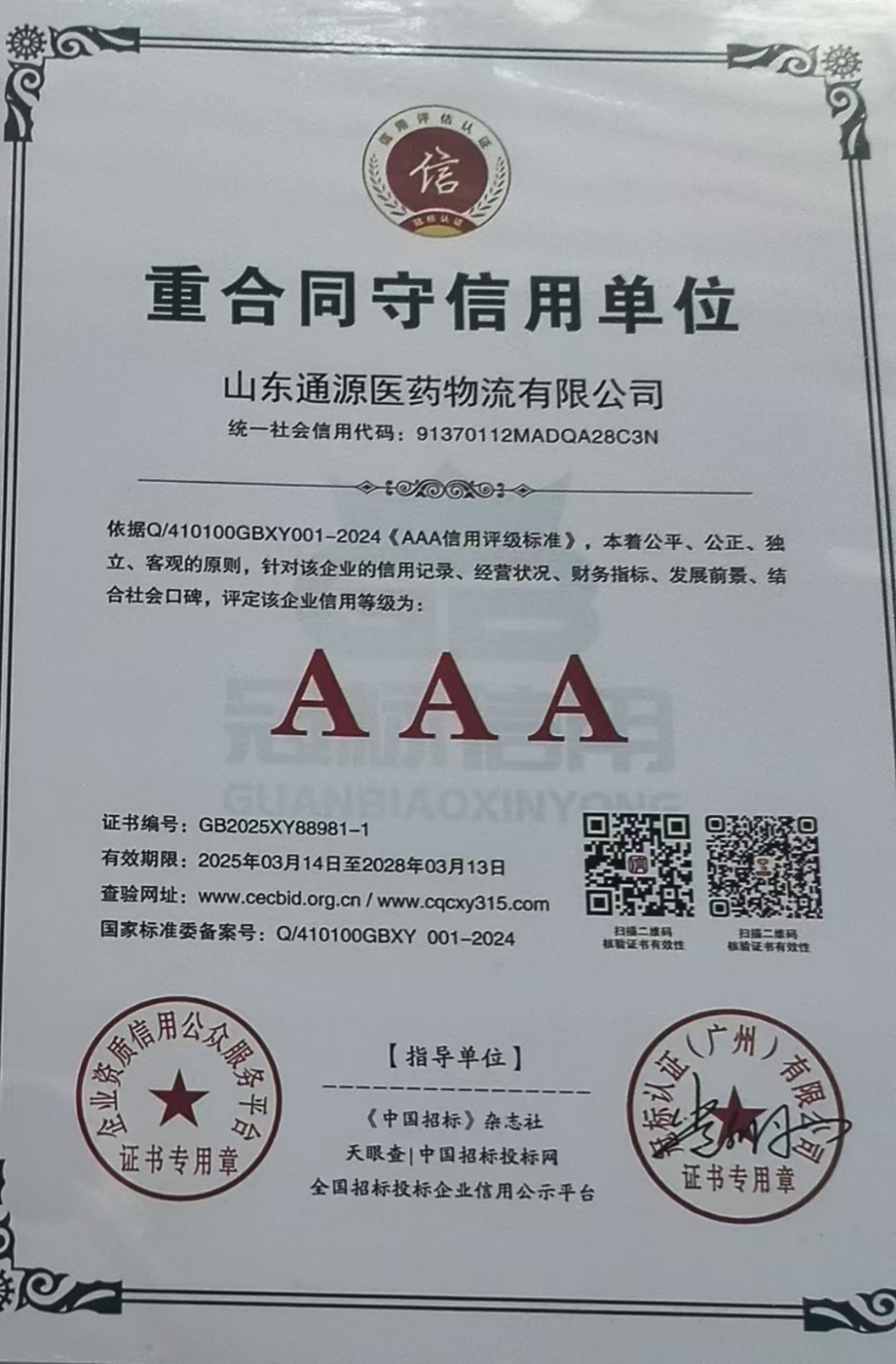 济南,2024年3月15日——近日,山东通源医药物流有限公司凭借卓越的企业信用表现,顺利通过Q/410100GBXY001-2024《AAA信用评级标准》的严格评审,被正式授予"重合同守信用单位"荣誉称号,并获评最高信用等级AAA级。